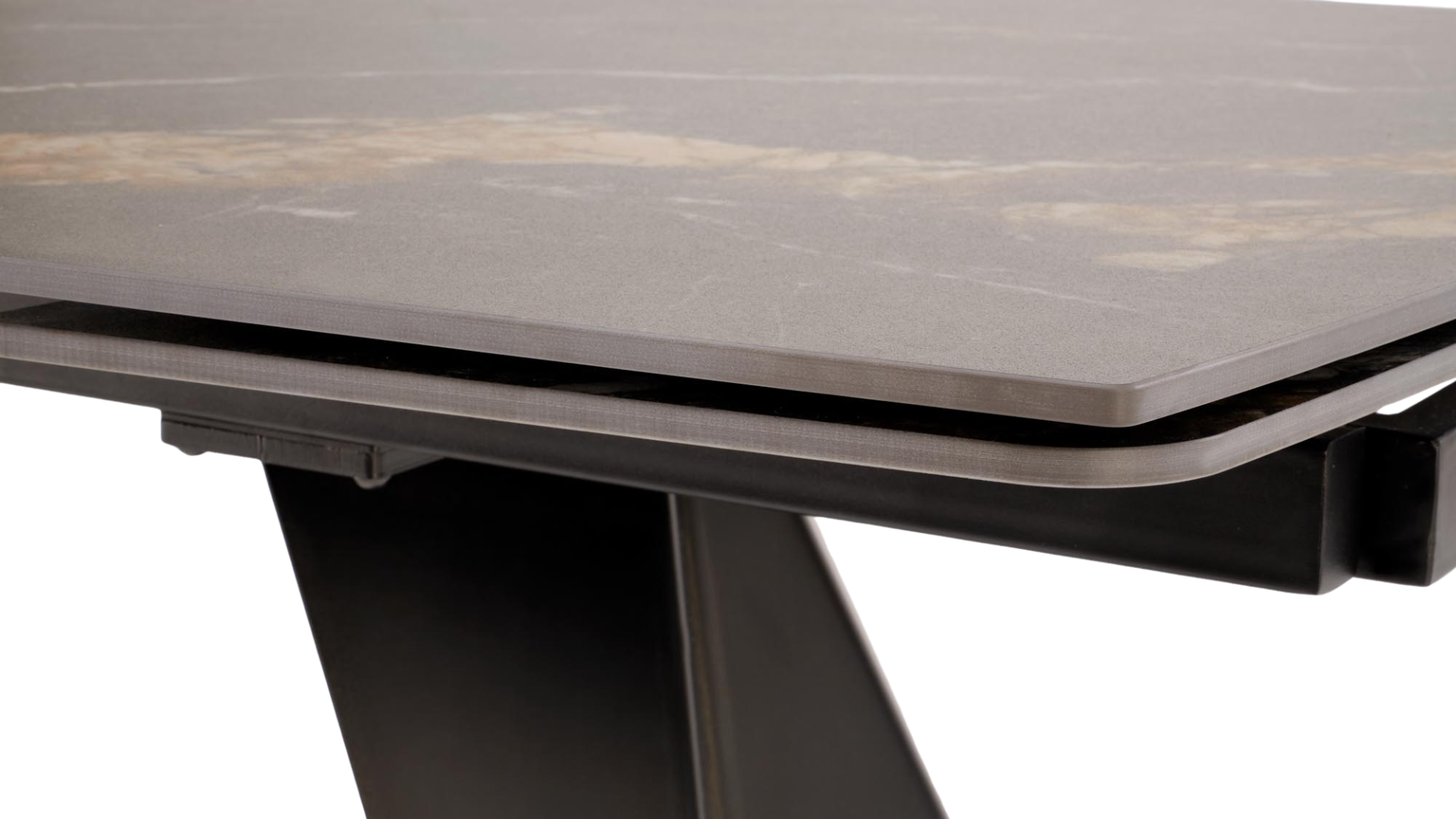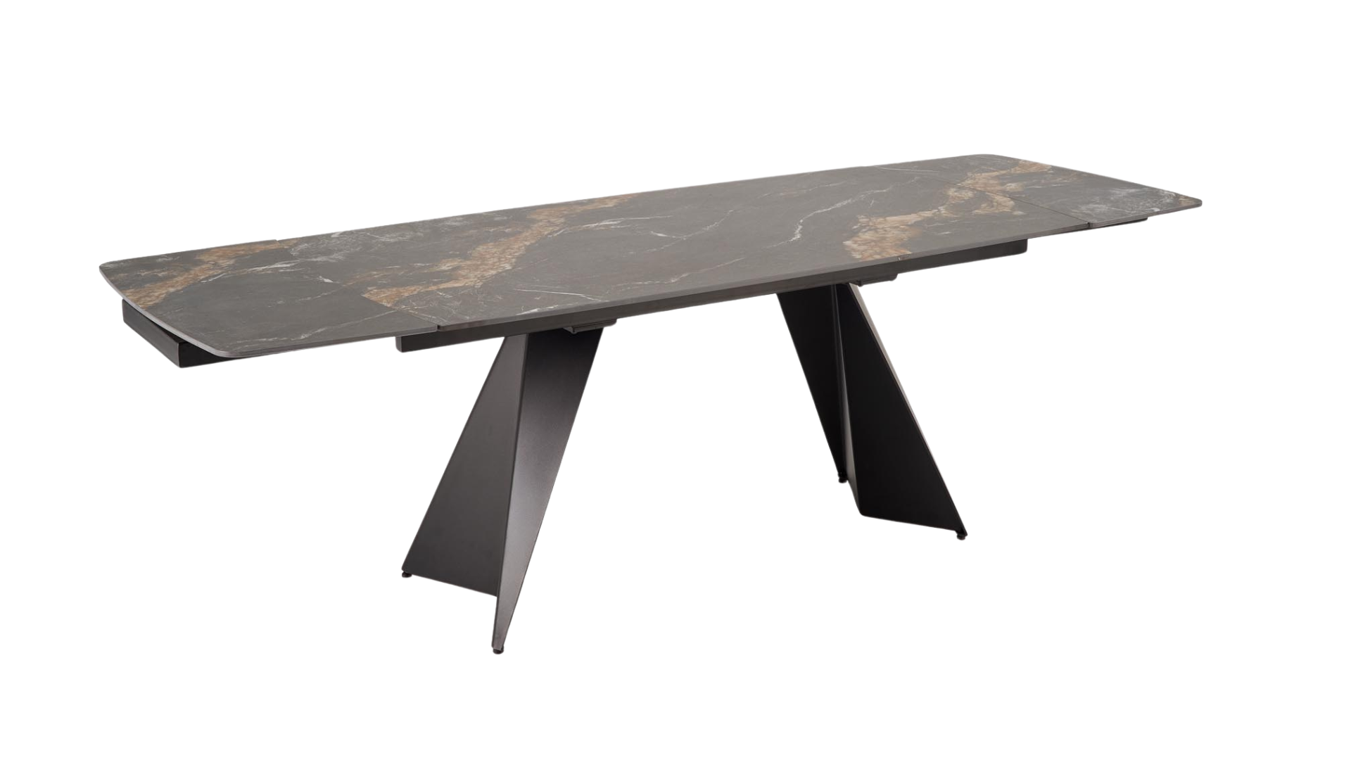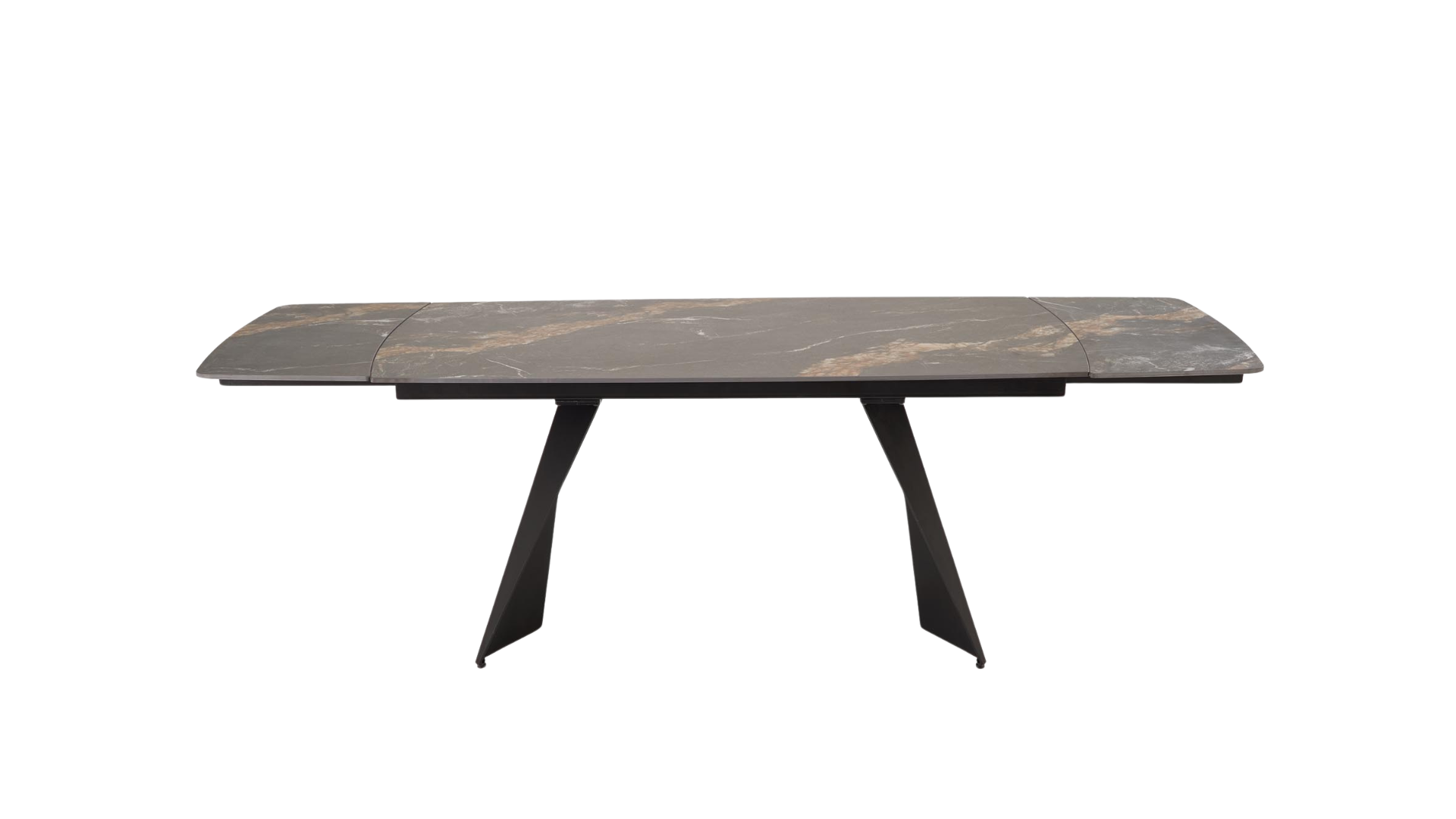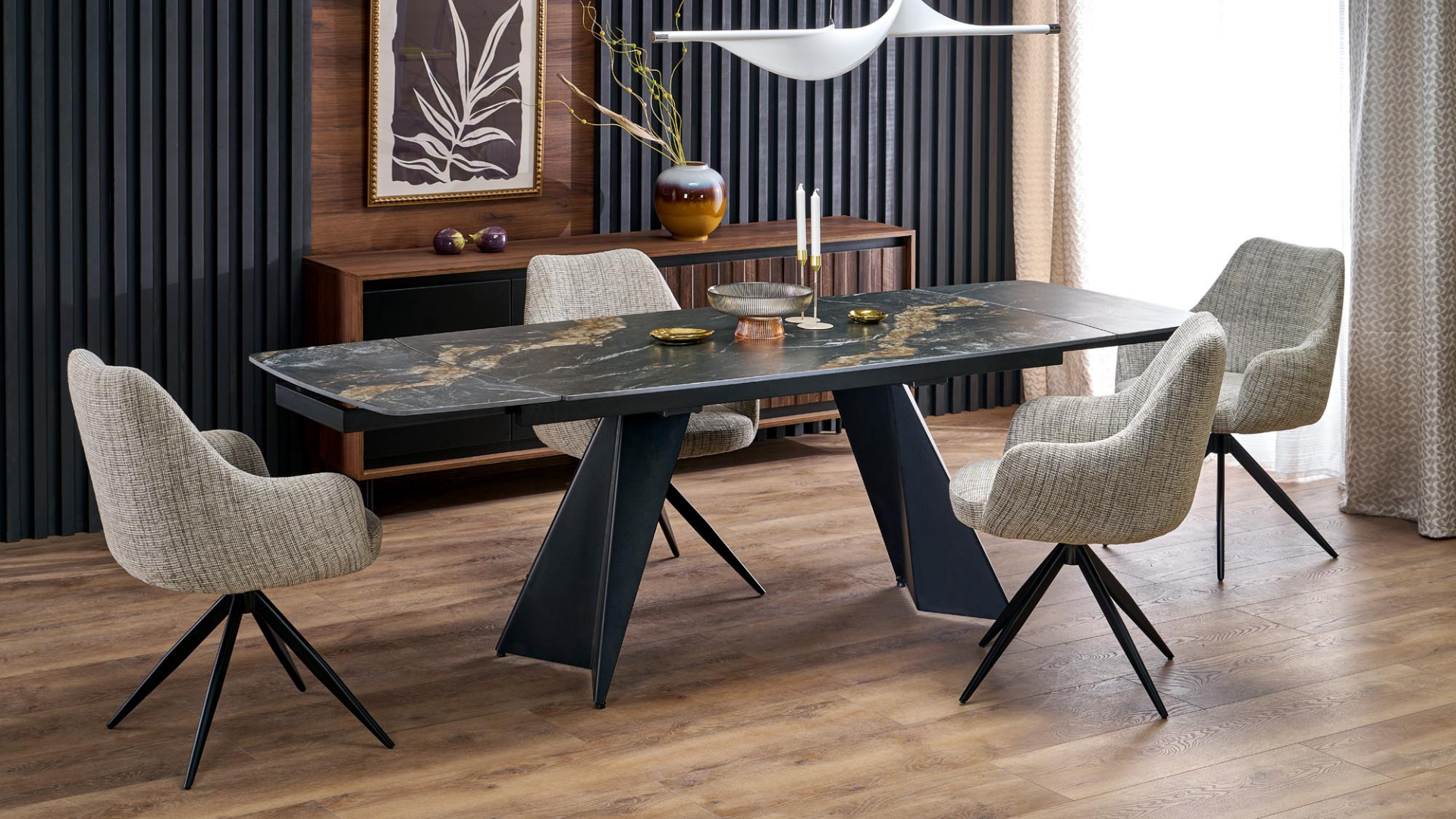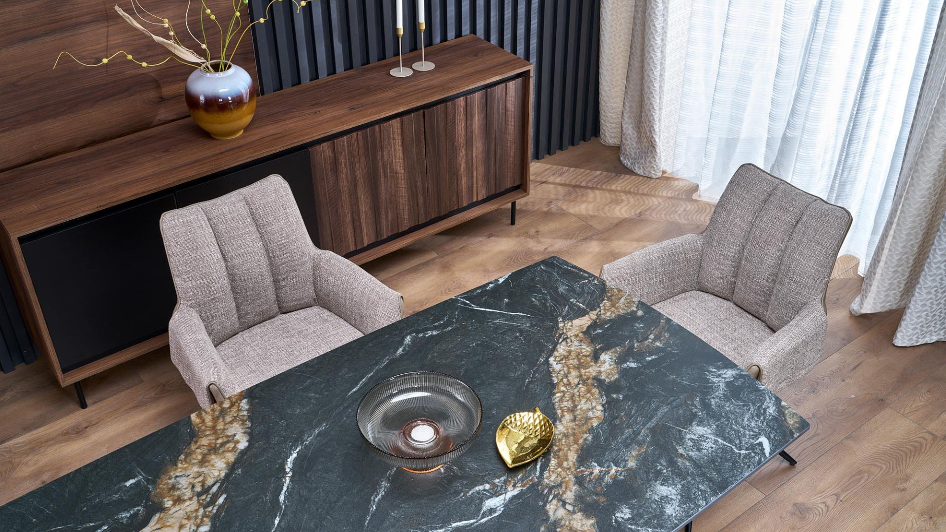 Az asztallap szinterezett kőből készült, amely vizuálisan is különleges textúrát és mélységet kölcsönöz az egész bútornak. A bővíthető kialakítás lehetővé teszi, hogy az asztal a mindennapi használattól a nagyobb összejövetelekig rugalmasan alkalmazkodjon az igényekhez.