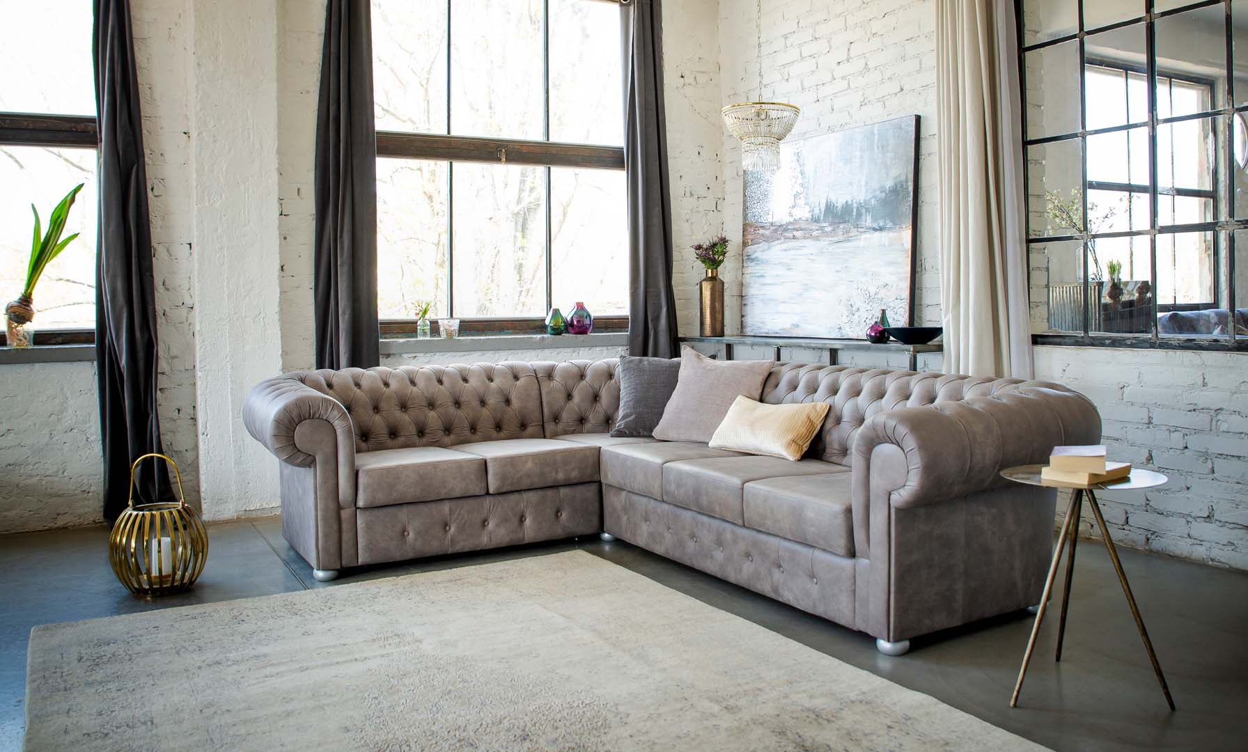 A Chesterfield Royal sarokelemének mindkét oldalán választható az ülések szélessége és a teljes bútor bevonóanyaga is. Szövetek és valódi bőrök, köztük anilin és teljesen nyers hatású bőrök is találhatóak.